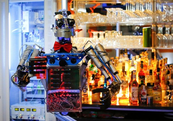 德國東部城市伊爾默瑙的機器人酒吧,機器人服務生「卡爾」正與客人進行互動。「卡爾」由機械電子工程師本·斯查菲爾研製,不僅能夠幫助人類服務生調製雞尾酒,還能與客人進行簡單對話。