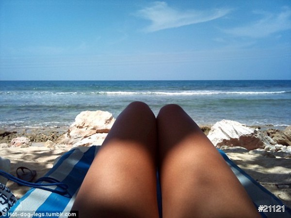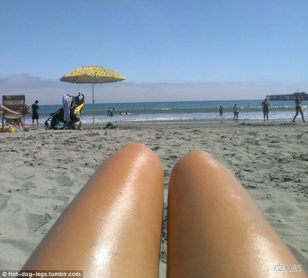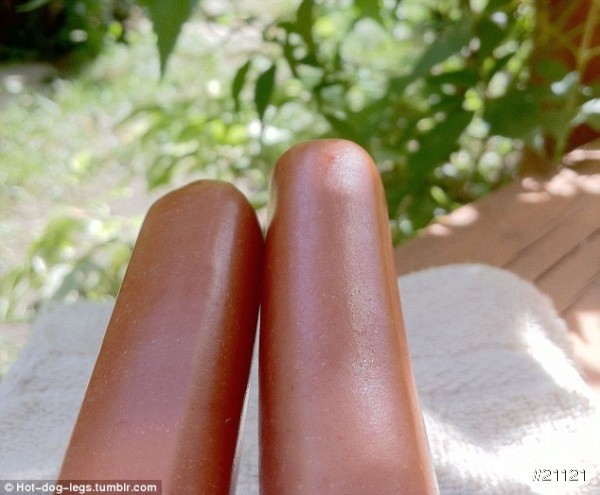 ▲熱狗經常被抹上點油來表現夏日塗過防曬油的腿,擺在陽光下的毛巾上,就能製造出一個平常的美腿自拍照。