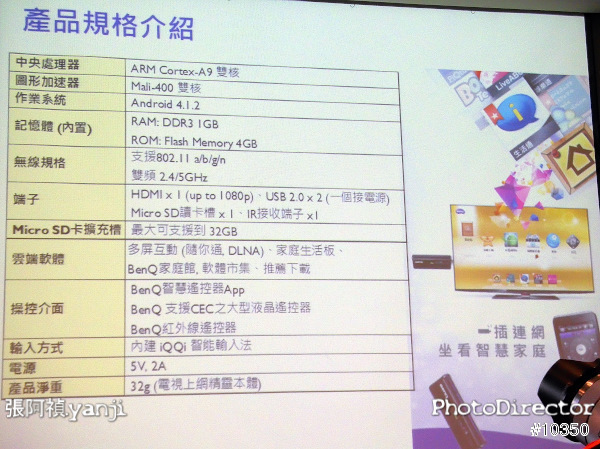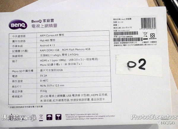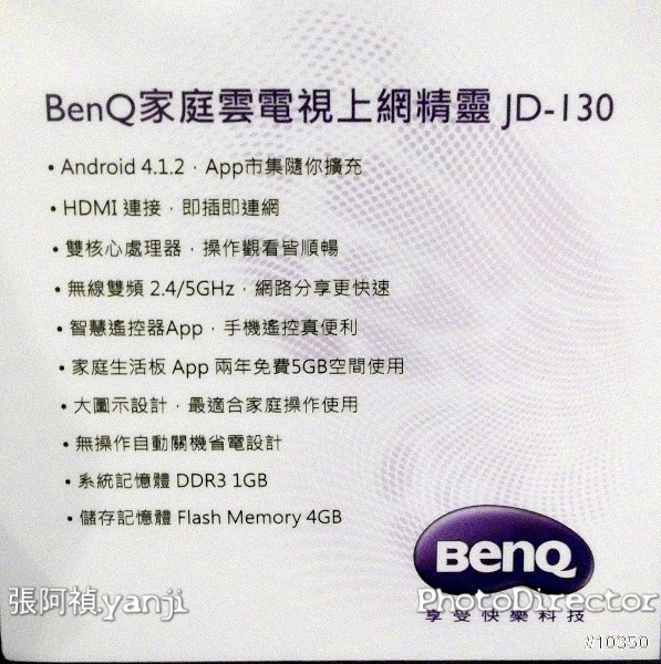 這支 BenQ JD-130 的中央處理器是 ARM Cortex-A9 雙核 1.5GHz、圖形加速器是Mali-400 3D 雙核、系統記憶體是DDR3 1GB,使用Android 4.1.2 Jelly Bean作業系統。乍看起來沒什麼問題,大約是一般中低階手機的效能,若是單純運行JD-130內建的系統,當然是OK。但JD-130是可以安裝相容於Android 4.1的APP,在未來使用者自行加裝諸多APP時,中低階手機的效能便無法提供給使用者最佳感受。