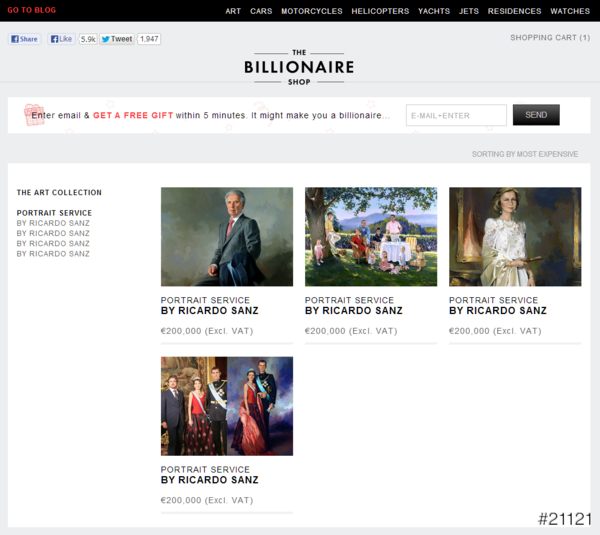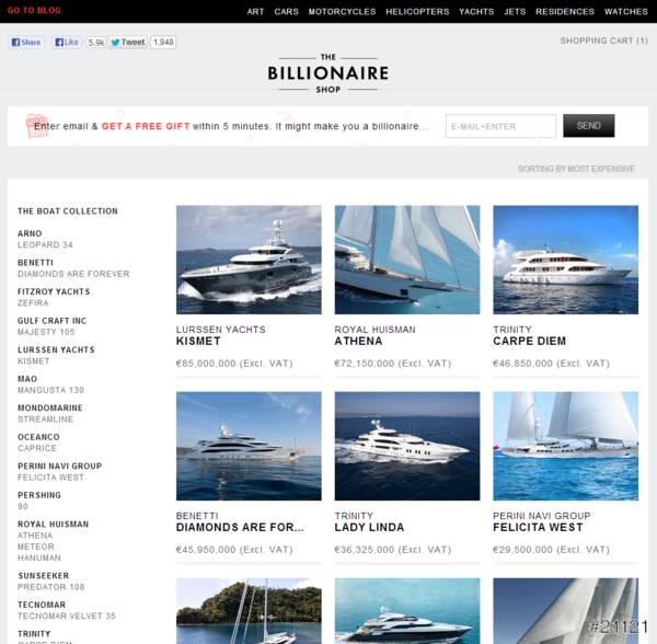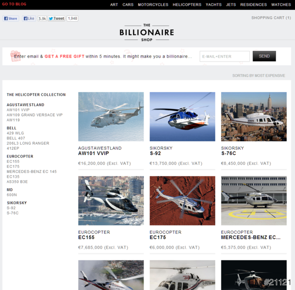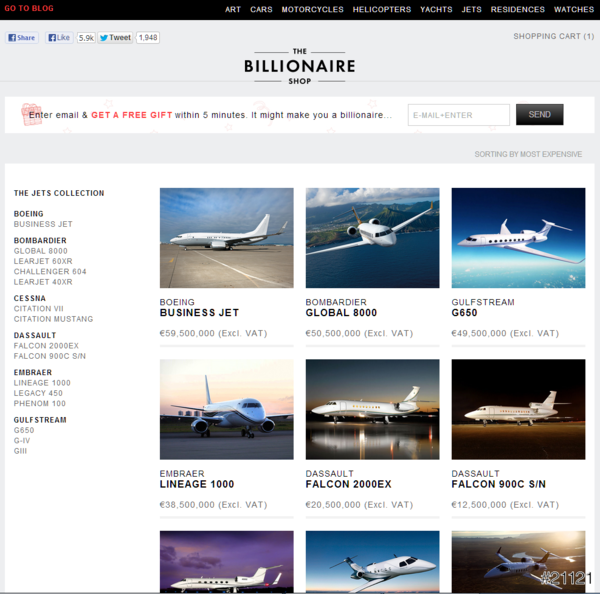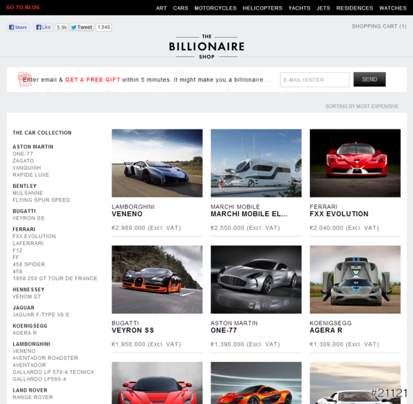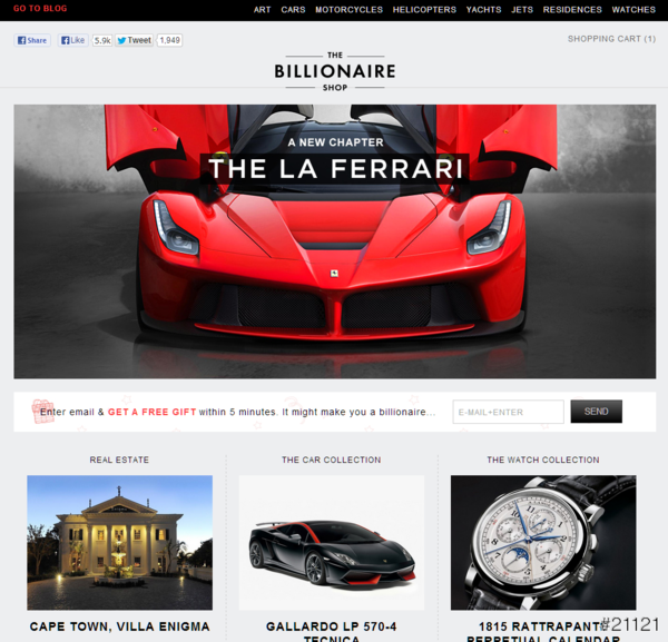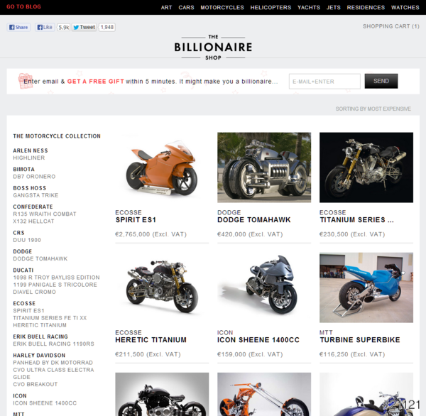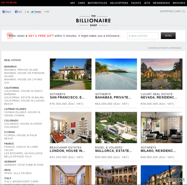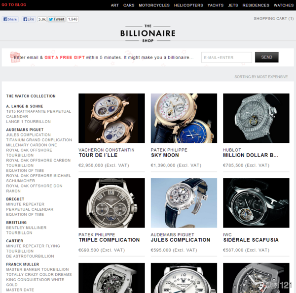 Yahoo拍賣、淘寶網會這麼這麼熱門的原因,除了東西種類夠多,一方面也抓住了人們撿便宜的心理,但對於錢多到不知如何花的人來說, 哪有閒情逸致一個一個比價,簡直是浪費生命啊,如果你也是屬於這種人,或是心裡有某種快要中樂透的預感,那麼可以來逛逛以下這個富人購物網站,但如果你不是,切記握緊滑鼠別手滑啊!