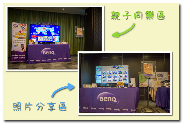 ▲除了先前提到各小組桌上的液晶電視之外.,活動現場還另外規劃了兩個體驗專區,分別是讓爸爸媽媽還有小朋友一起透過 BenQ 智慧電視棒體驗透過大螢幕打電動樂趣的「親子同樂區」以及藉由 BenQ 自行研發的「家庭生活板」APP 即時展示現場活動照片的「照片分享區」,關於這兩個專區先暫時留到稍後再做詳細說明,接著讓我將文章分成以下幾個段落: