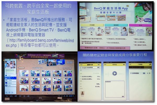 ▲除了 BenQ 智慧電視棒 JD-130 之外,BenQ 在本次體驗活動中也強力介紹自行研發的跨平台線上社群中心「家庭生活板」,簡單說家庭生活板就是一個提供使用者和家庭成員上傳照片、新增行事曆、留言板傳話的 APP,一看到家庭生活板,令我立即回想起以前在冰箱上用磁鐵貼上生活照、備忘錄的那股熟悉感。此外家庭生活板不論是在 Windows 、 Android 或者是 iPhone 都可以連上線暢通無阻,我覺得 BenQ 在這部份很用心,發展出 BenQ 智慧電視棒 JD-130 和大陸小廠電視棒截然不同的應用方式,