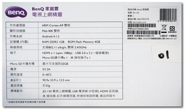 ▲包裝盒的背面詳細註記了 BenQ 智慧電視棒 JD-130 的各項規格以及重要盒裝內容,像是使用 Cortex-A9 架構 1.5 Ghz 雙核心處理器、1GB 記憶體、4GB 儲存空間、雙頻無線鍵鼠支援、內含保固卡等...... 大家買到時可以檢查一下有沒有缺少甚麼,另外我發現我們這桌試用的是 2013 年 7月中國製造的產品,幾乎是剛出廠就來到現場火速讓大家試用! 由此可看出 BenQ 毫不吝嗇將最好的產品趕緊和大家分享。不過我覺得處理器部分沒有詳細註明型號感覺有點不老實,A9 雙核心處理器這麼多款,性能也各有好壞,建議 BenQ 日後要註明清楚,消費者的感受會比較好一點。