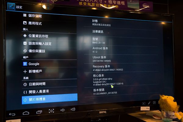 ▲進入 BenQ 智慧電視棒 JD-130 的設定選單中,發現 BenQ 智慧電視棒的確是如包裝盒上所寫的使用 Android 4.1.2 Jelly Bean 作業系統,而活動當天我也在 Q&A 時間詢問 BenQ 產品代表 Roger 有關系統更新的事宜,Roger 表示 BenQ 有規劃日後更新至 Android 4.2 版本的事宜,我想應該有機會見到同一裝置中允許多個家庭成員登入帳戶使用的功能,可喜可賀:D