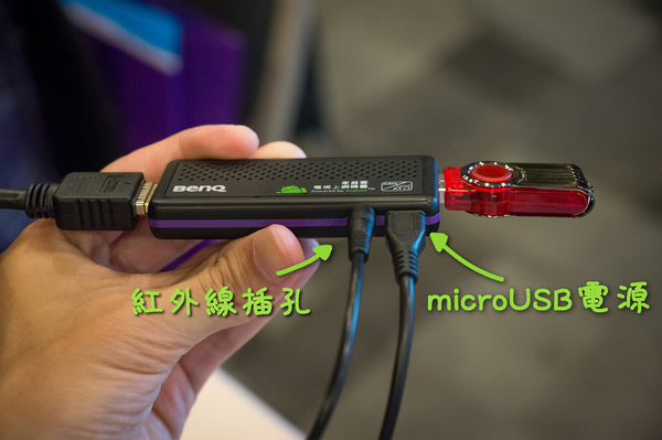 ▲底部配置了一個紅外線插孔和一個 microUSB 電源孔,如果電視有提供電源輸出也可以直接將線材連接電視和 microUSB 電源孔這樣就不用另外找插座了。一旁還可見到象徵 BenQ 的紫色飾條圍繞主機一圈作點綴,配色還蠻有質感的,