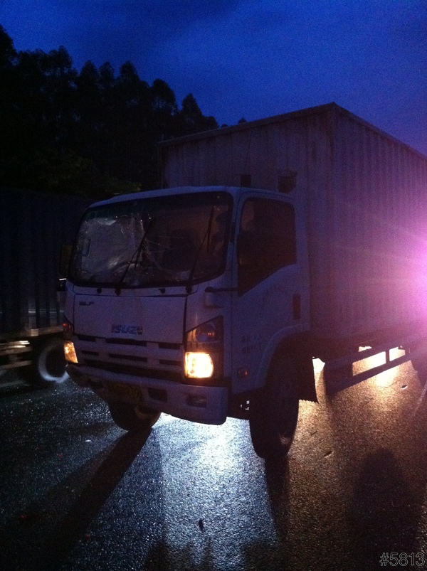 由於是晚上了,又在高速公路上,沒法太紀實的把每個經過拍下來,先拍了撞了我們車的一台小貨車,前擋風玻璃損壞,但人是沒事的