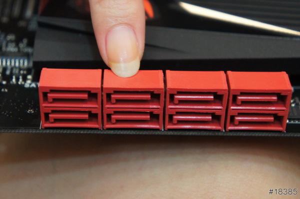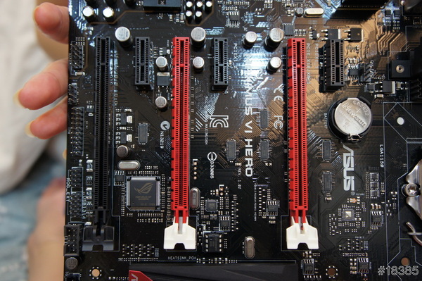 介面插槽一共有2組 PCIe 3.0/2.0 x16(紅色x16或一起使用x8)、1組 PCIe 2.0 x16(黒)和3組 PCIe 2.0 x1,支援NVIDIA SLI以及AMD CrossfireX