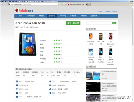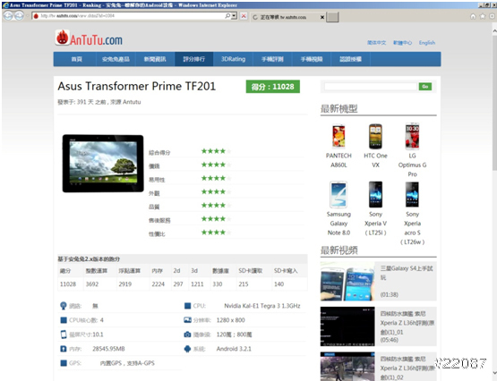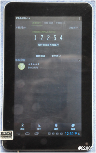 在網路上這台的相關資訊實在太少了,只找到了用安兔兔3.3做簡單測試, 結果六項測試下來的分數為12254 跟網站內同級的平板Acer A510 11097 跟Asus TF20111028 比起來居然還高, http://tw.antutu.com/Ranking.shtml 真是蠻令人驚訝的,有12254的水準,而且還贏了雙a的平板,看來這台真的應該還不賴吧!