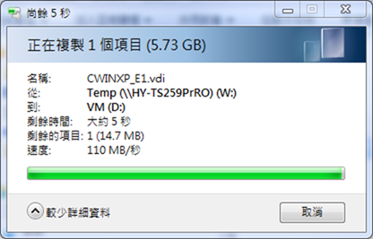 這個測試,我選擇單檔5.73GB的檔案。而從PC複製到NAS過程中,開始、中途、結束前的傳輸速度分別是113 MB/s、110 MB/s、108 MB/s。