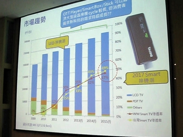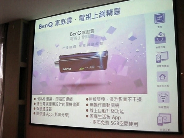 根據數據顯示2012年是此次LED的換機潮,下次的換機潮大約在2017年,智慧電視是下次換機潮的主要關鍵, 對於剛買LED的消費者不會那麼快想換機, 使用期大約是5年. <=這個數據調查挺準的, 我們家及娘家婆家都是在這一、二年內陸續把電視換成LED, 要我們在短期內再把電視升級成智慧電視, 實在是不大可能. 因此BenQ提供了一個解決方案 - BenQ家庭雲,讓家電馬上變聰明.不只是電視,投影機也可以喔!