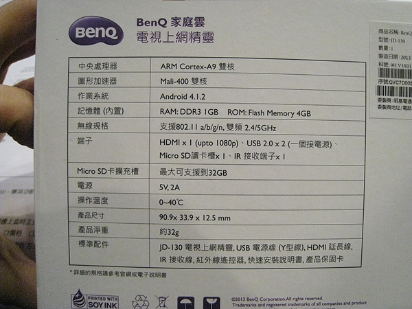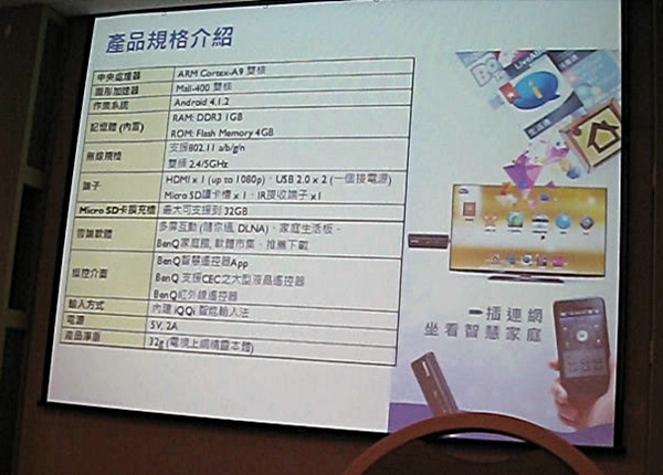 BenQ家庭雲的規格及特點 : 其實重點在於雙核心搭配1GB的記憶體,整個速度就起來了,比較貼心的地方在於無線網路部分,多了5Ghz的支援; 另外除了內建記憶體之外,還可以用記憶卡擴充至32GB, 擴充方面有兩個USB可以使用,作業系統為安卓4.1.2版~都是目前比較主流的規格,家庭雲簡單來說就是一個os是Android系統的小電腦,