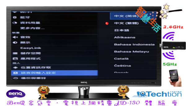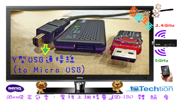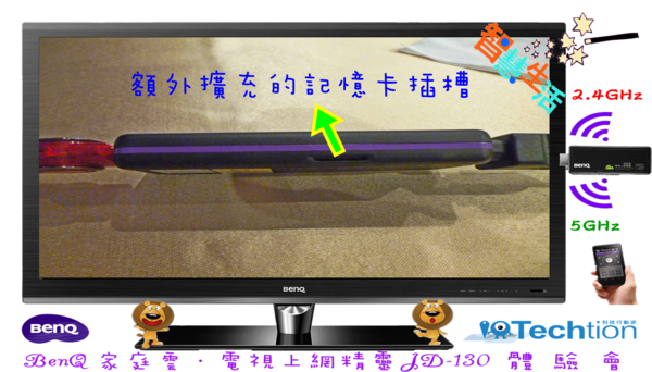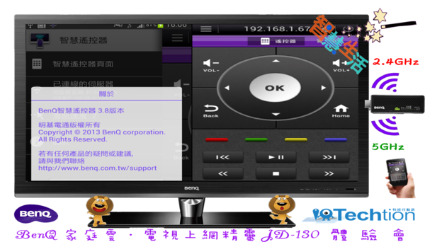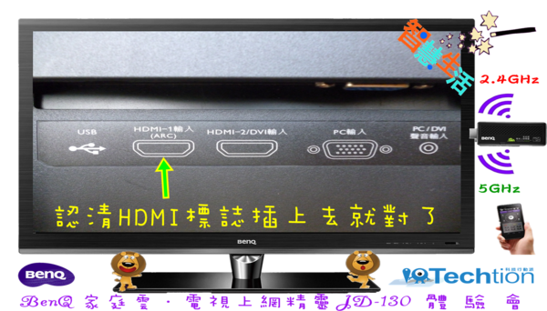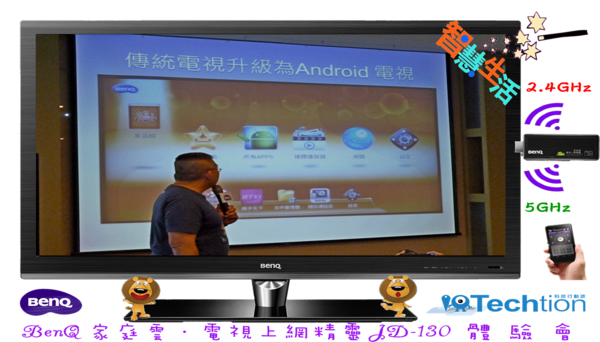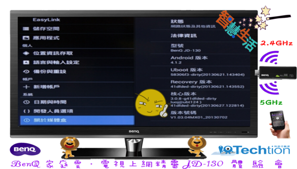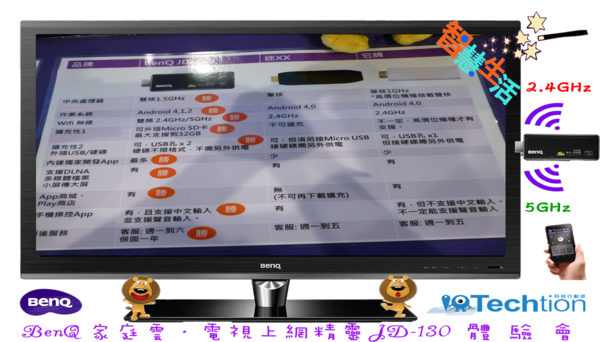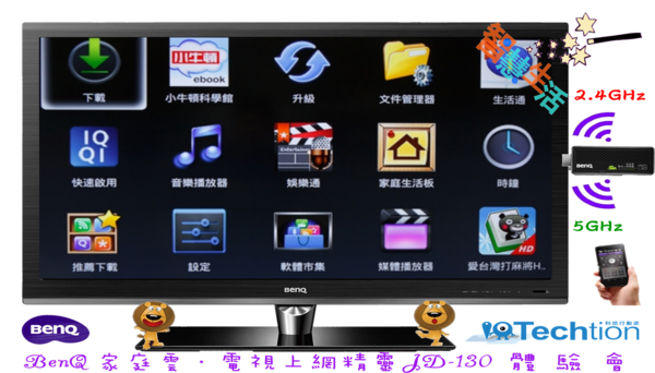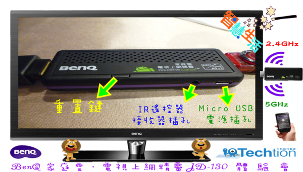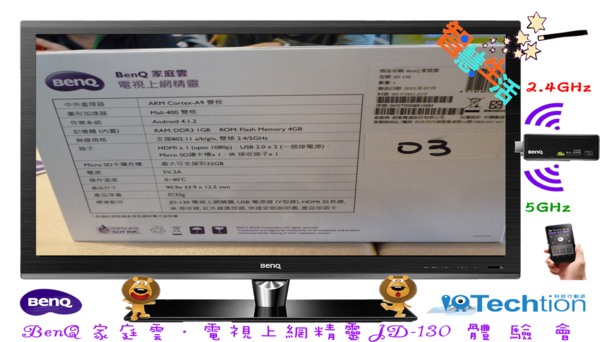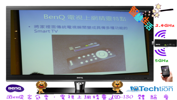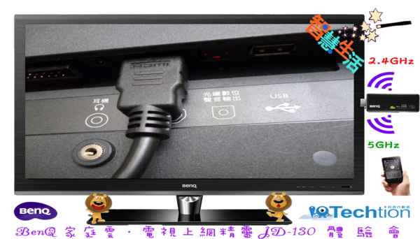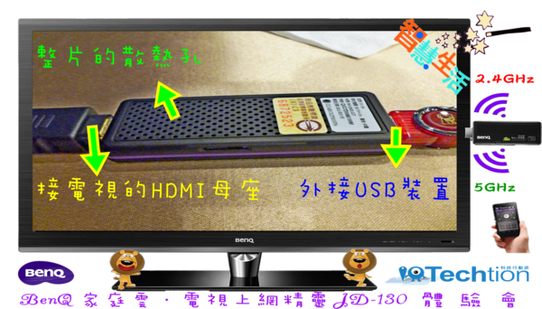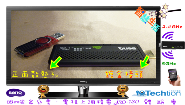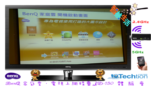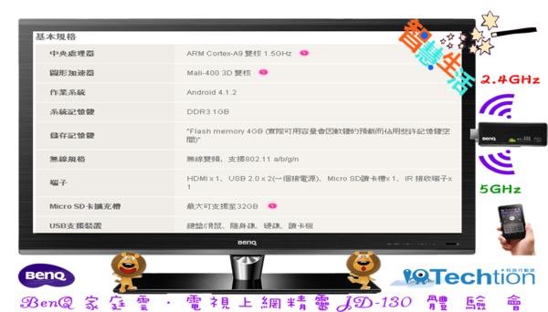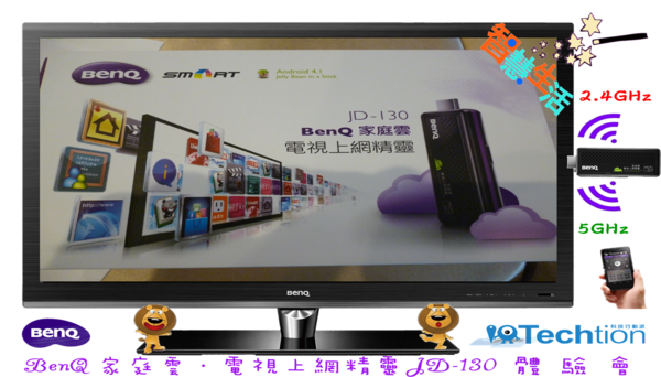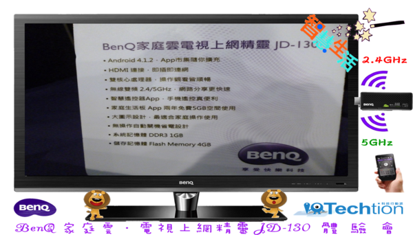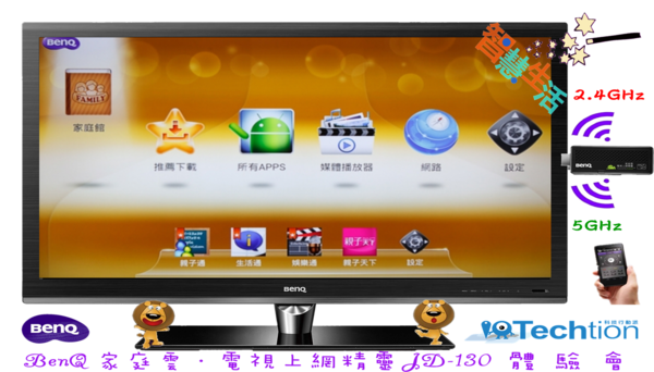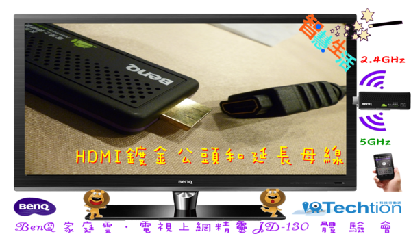 電視在家庭生活中是比冰箱和手機更為重要的東西,不愧是家庭一哥,電視除了可看無線台外,加值更可看第四台和MOD,不過這還是統統屬於『看電視』的範疇內,您一定會說,那你可外接筆電看影片或把電視當螢幕用阿,這樣接起來,我看整個客廳都快變成盤絲洞了,難道家庭一哥就這麼點能耐?不諱言的,智慧型電視是未來趨勢,但價格比起相同尺寸的一般數位電視來說貴了5千至1萬不等的價錢,今日BenQ上網精靈-JD-130的誕生賦予了一般數位電視全新的智慧,不但安裝簡單,也沒有擾人的一堆影音線材,和一般數位電視加起來的價格上也比純智慧型電視便宜了許多,最棒的是任何廠牌的數位電視皆能採用,只需要一個HDMI的介面即可,內建無線雙頻,不看電視也能用電視的大螢幕來上網,更聰明的是自己還能韌體更新,簡直就是一台麻雀雖小,五臟俱全的迷你智慧型電腦。雖然市場上這類產品五花八門,但應該很多玩家都非常期待BenQ的產品能在市場上熱賣,此次Android & BenQ雙強聯手,就是要讓大家感受一下什麼是最夯最潮的電視棒!