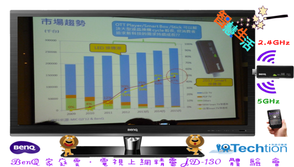 ▼ 根據BenQ所作的市場趨勢調查,台灣的Smart TV的滲透率在2013下半年會超過40%,也就是每3家用戶,就會有2台Smart TV,以5年為一週期的換機潮來評估,到了2017年幾乎就是Smart TV的天下,而距離2017年還有4年多的光景,在這段期間內,有些家庭只買一般數位電視,但也想要體驗智慧生活,這時BenQ聽到大家的心聲了,電視上網精靈JD-130正是為此而產生,讓目前一般數位電視用戶也能享受智慧生活。