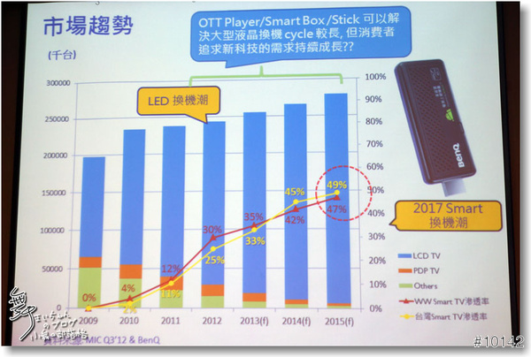 ▲好,言歸正傳,根據MIC調查,一般消費者買液晶電視的換機頻率大概是5年,所以剛買電視的消費者,不會馬上換電視,但還是想追求新科技,所以BenQ推出電視上網精靈來滿足使用者