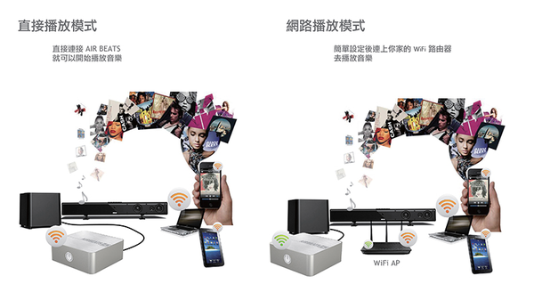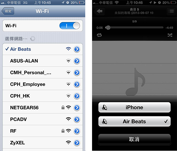 ▲在iOS/Android裝置搜尋「Air Beats」的無線訊號,就能連接上。連接上之後,選擇Air Beats 播放,就可以開始享受音樂饗宴了。