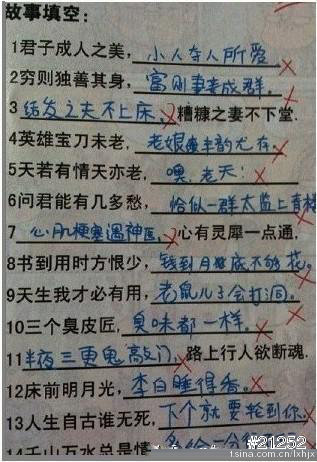 網路上流傳的國文測驗卷,考的是著名詩詞填空題。