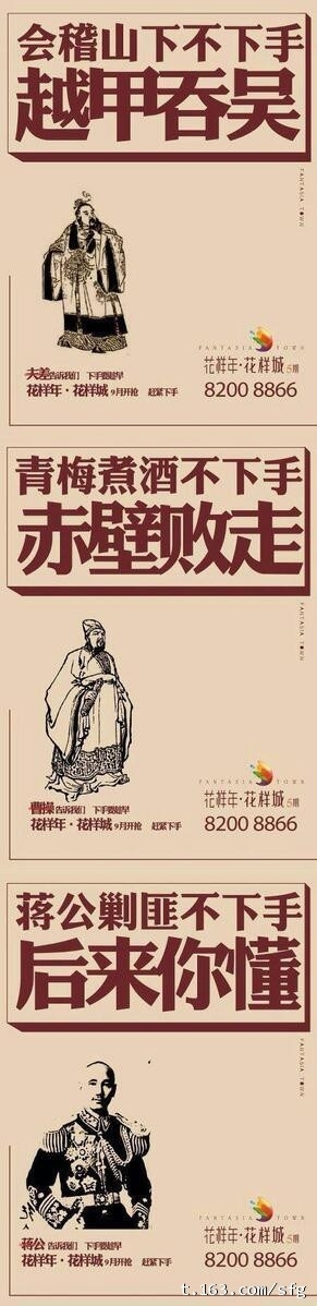 [分享] 蔣公剿匪不下手,後來你懂 生活 · moconing · 發表於 2013-09-24 19:07 · · 檢舉 列印版 twitter plurk 1.8萬閱讀次數 前陣子在成都有個賣房子的廣告。 廣告圖中畫出夫差、曹操、蔣中正的像,然後配上三句話 「會稽山下不下手,越甲吞吳」 「青梅煮酒不下手,赤壁敗走」 「蔣公剿匪不下手,後來你懂」 不知道這個作者後來下場如何 1 個人說讚 收藏 快速回應 引言回應 登入來回應 header home