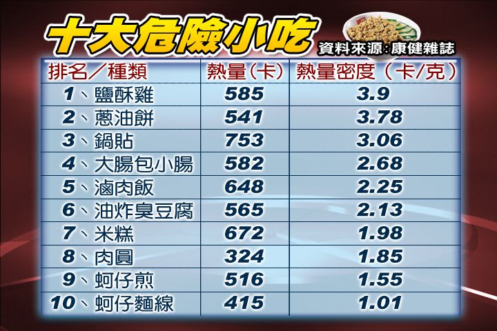 台灣夜市美食眾多,看似份量小但熱量卻高得驚人, 北市衛生局就公布了士林夜市10大代表美食的熱量表