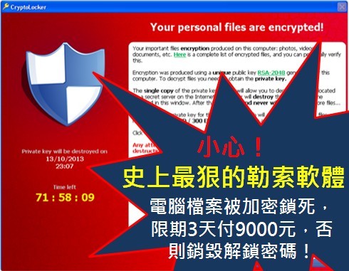 勒索軟體CryptoLocker大舉入侵臺灣,公司與個人陸續傳出災情,該軟體會將受害者電腦加密,導致檔案無法使用,更限期3天支付9,000元贖金,否則將毀損解密金鑰