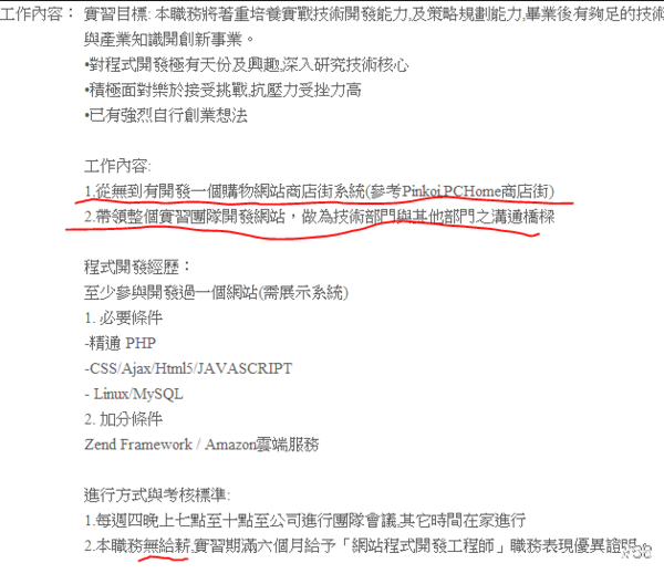 最近各大網站狂批這個在人力銀行上發現的職缺,打著學生實習的名義,內容竟然是「從無到有開發一個購物網站商店街系統(參考Pinkoi,PCHome商店街),帶領整個實習團隊開發網站,做為技術部門與其他部門之溝通橋樑」,而薪資竟然是半年後給你一張該公司開出的「網站工程師證書」。