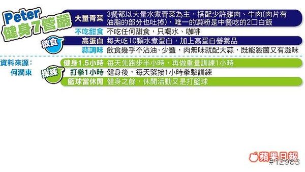 期間他每餐皆以大量水煮青菜為主、搭配少許肉片,肉有油脂的部分要先咬掉,不加佐料只靠蒜頭提味;外加每天10顆蛋白及高蛋白營養品,迅速從78減至73公斤,肌肉線條更加明顯。