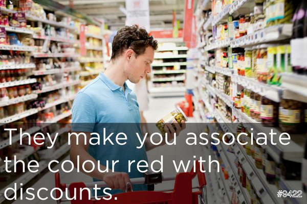 賣場裡許多特價品都會以紅色標籤區隔,以便讓消費者得知目前此項商品正以比一般更低的價格出售。一旦此觀念在消費者心中根生蒂固,就算是一般沒有特價的商品使用紅色標籤,消費者也會以為有特價進而選購。