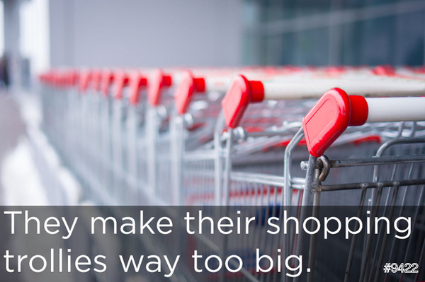 在1938年發明的購物車,其尺寸遠遠大於1個家庭每週所需食物量,其目的就是在於鼓勵你多買一些。