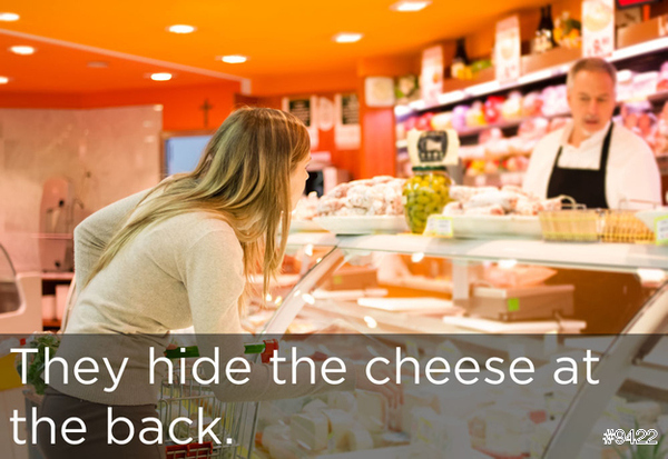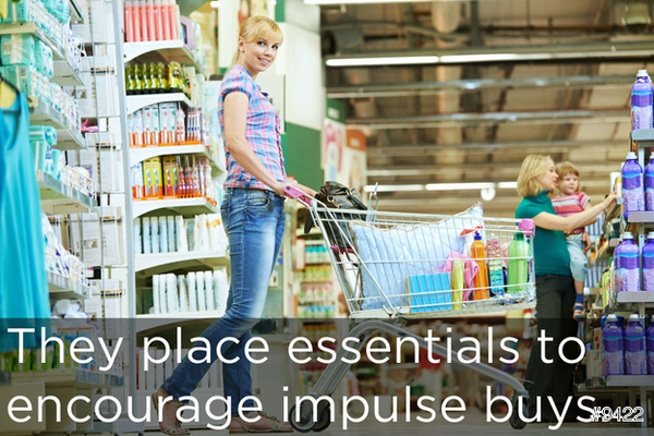 通常乳製品會擺放在賣場的尾端,強迫你非得走過整個賣場才會買到,在這途中消費者就有可能順手拿了其他的商品。