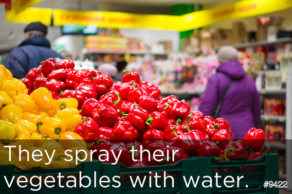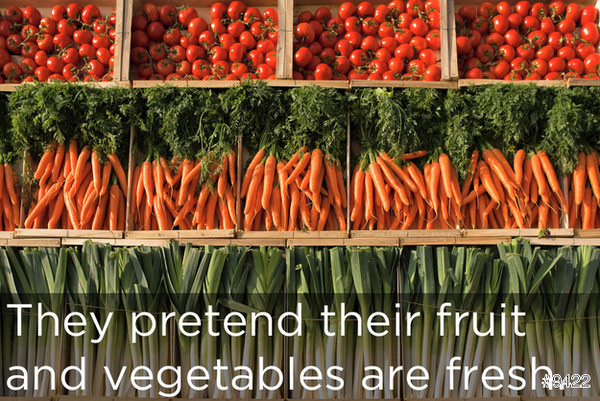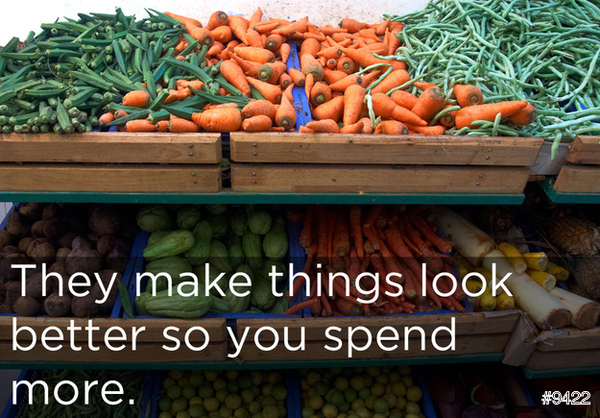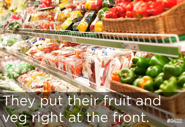 通常青菜水果等新鮮食品都會放在賣場入口處,但仔細想想這根本不合理,因為如果你拿了這些東西,他們很容易被之後購買的商品壓爛。因為其新鮮的氣味和繽紛的顏色能夠讓你產生愉悅的心情,進而購買更多的商品。再者,你也會因為購買了這些較為健康的蔬果,而產生「買一些垃圾食品回家吃也沒關係」的心態。