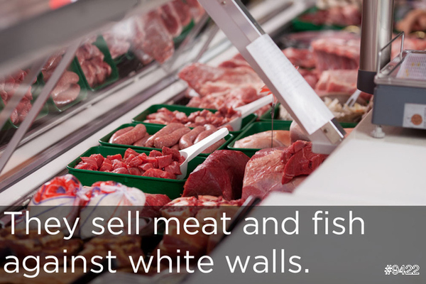 肉類或是魚類產品經常擺在白色的櫥櫃中,看起來較為新鮮。
