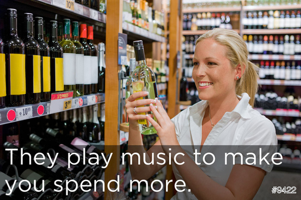 慢節奏的音樂使人在賣場裡待得更久,古典音樂則是讓人買得更多。研究顯示,在酒類商品區播放法國歌曲,可提升法國酒的銷量。