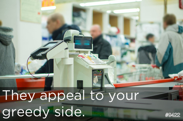 收銀機櫃台前一定都會放些巧克力、餅乾、糖果、口香糖之類的東西,而且跟賣場裡大包裝不同,通常都是數量較少的包裝,讓人有種「老娘這麼拼命為家中付出,提著大包小包回家,買個零食犒賞自己也不回過吧!」的感覺,很容易讓人順手帶走1包,特別是當家長受不了孩子的哭鬧,也會買個幾包。