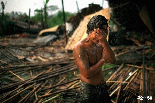 15. 2008年家園在海嘯中全毀的人在大雨中用手摀著臉。