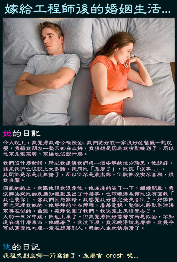 嫁給工程師後的生活 生活 · moconing · 發表於 2013-11-08 15:47 · · 檢舉 列印版 twitter plurk 1.6萬閱讀次數 3 個人說讚 收藏 快速回應 引言回應 共 1 則回應 1 樓 · 翡璃月 · 發表於 2013-11-09 22:31 · 檢舉 真的一言道出宅宅工程師的心聲阿... 1 個人說讚 引言回應 登入來回應 header home