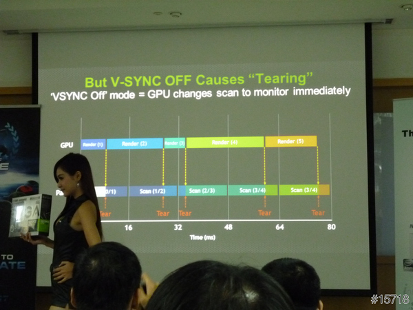 ▼關閉垂直同步時,因前面已延遲,所以當畫面即時輸出時,會造成畫面上下部內容不同步,而有破圖(TEARING)的現象。