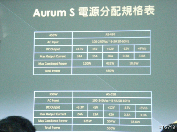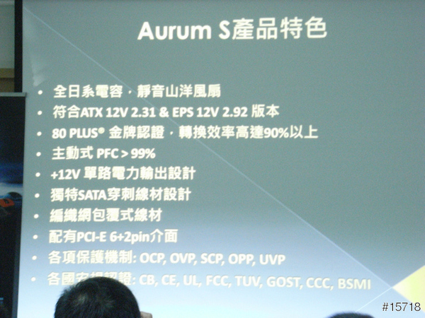 ▼Aurum S產品的特色介紹:全面採用日系電容及靜音三洋風扇,並有5項保護機制,轉換效率90%以上。