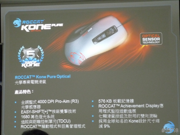 ▼ROCCAT Kone Pure Optical是光學專業電競滑鼠,搭載576K記憶體及七顆滑鼠鍵