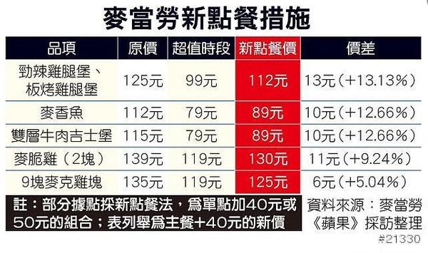 《蘋果》試算,新點餐方式讓勁辣雞腿堡、板烤雞腿堡、麥香魚、雙層牛肉吉士堡、麥脆雞和九塊麥克雞塊的套餐,較先前超值時段貴6元至13元,漲幅5~13%,以前兩者漲13元最多。