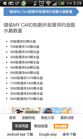 50元點卡儲值後會有53顆水晶,150元會有163顆水晶……