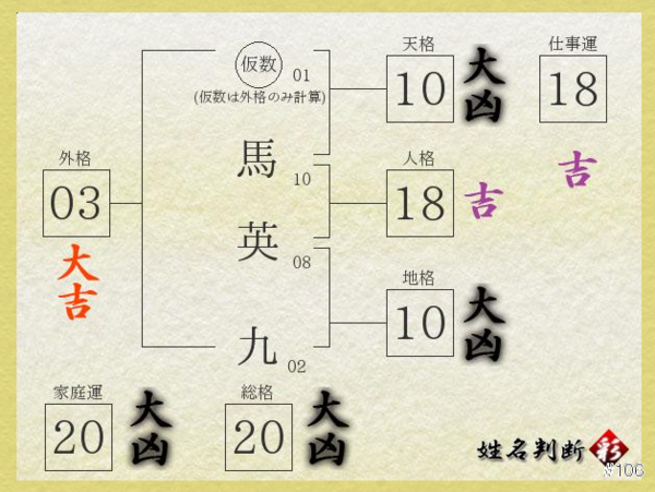 馬(10画) + 英(8画) + 九(2画) で 20画となり大凶です