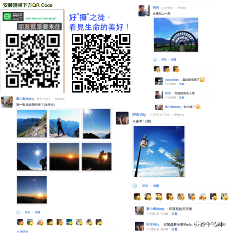 哈囉~我在「來往」APP中搞了一個攝影同好的群組(扎堆),對拍照有興趣或是身邊有一些不錯的照片願意分享,不需要很專業的相機、不需要很專業的技巧,純粹個人喜好,即時隨手的手機相機拍的照片,都歡迎來我的「來往」群組(扎堆)上分享交流喔~可以先透過下列網址或是下方左邊QR code下載安裝App,註冊完畢後,再掃一下右邊的QR code就可以看到很多不錯的風景照喔~