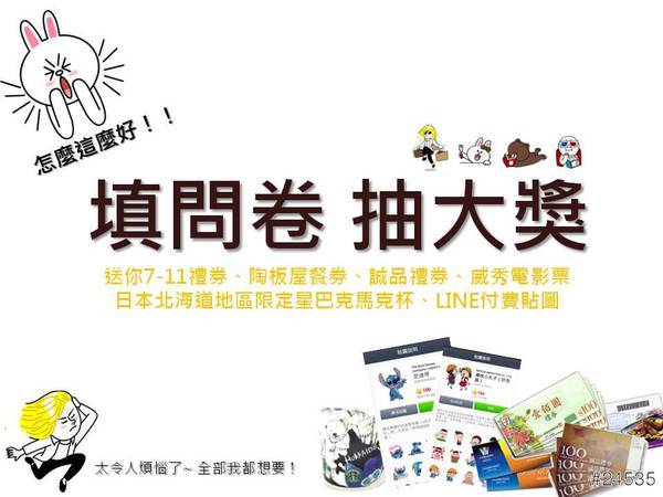 ★抽獎贈品:陶板屋餐卷、威秀電影票、自選款式LINE付費貼圖、7-11禮卷1000元、日本北海道地區限定星巴克馬克杯、100元誠品禮卷