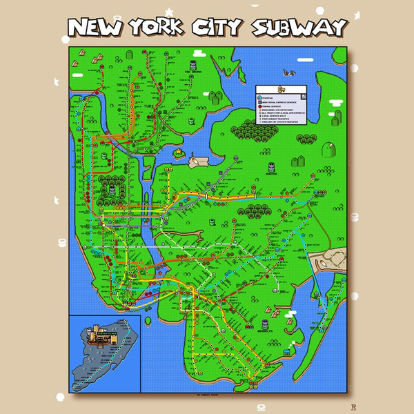 [分享] 超級瑪莉兄弟風格的地鐵路網圖 遊戲 · 小治 · 發表於 2013-12-09 18:46 · · 檢舉 列印版 twitter plurk 6.5千閱讀次數 看膩了單調的捷運路線圖嗎? 有位藝術家Robert Bacon 將紐約的地鐵路網圖改造成Super Mario World的風格 從此搭地鐵就像在闖關 真希望捷運也能推出類似的設計(我要把公司那站當成魔王關啦!) ▲與官方路網圖比較 ▲還有Super Mario Bros. 3代的地圖版本 ▲影片中有更多地圖細節 來源 1 個人說讚 收藏 快速回應 引言回應 登入來回應 header home