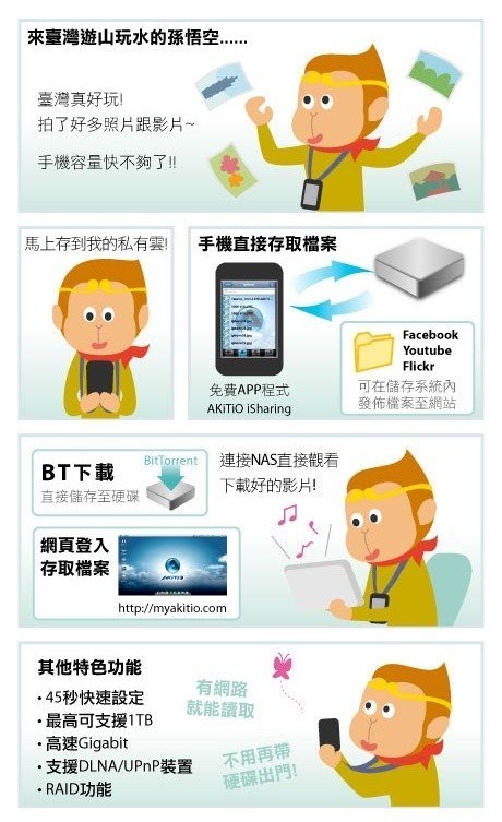 能將存放在內部的影片、照片、音樂等檔案,透過DLNA模式分享出來,PS3、XBOX360等裝置不需任何改裝,即可連結到「迷你私有雲」中的目錄,直接存取播放收藏的音樂影片喔。