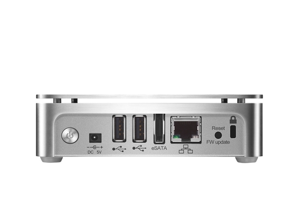 ▲IO 介面配置(由左至右)為:電源開關、DC 5V 變壓器插座、USB 2.0x2、eSATA、10/100/1000 BASE 乙太網路插座、Reset 重置鈕以及防盜鎖孔。