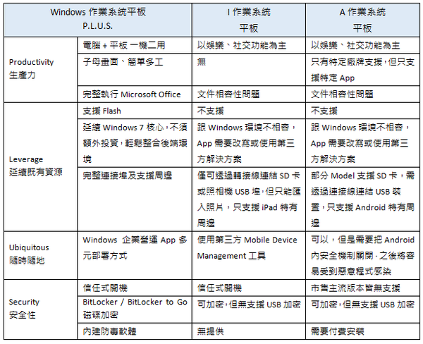 Windows平板完美串接企業內部營運App與x86應用程式,透過「開始畫面控管」功能,能夠根據不同部門、不同職位的需求,輕易地提供不同的應用系統,讓IT人員更易管理企業員工的作業環境;多工子母畫面設計讓使用者能夠不須切換螢幕即可一邊進行傳統桌面工作,一邊透過Skype App或是郵件App與同仁、客戶或是合作夥伴保持聯繫,符合企業追求高生產力與高效能的需求;此外,Windows 8.1支援USB 3.0快速傳輸、Miracast無線投影以及NFC等最新技術,並可以完整介接各式即有周邊設備,讓行動工作的效益更加乘。