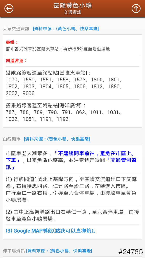 手指一按,馬上帶你看黃色小鴨下水,裡面有相當豐的交通資訊,自己開車或客運都能通喔。