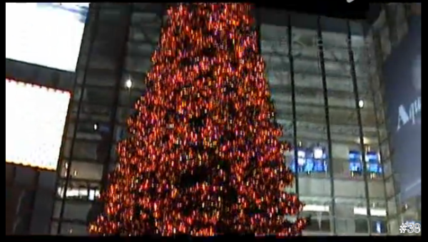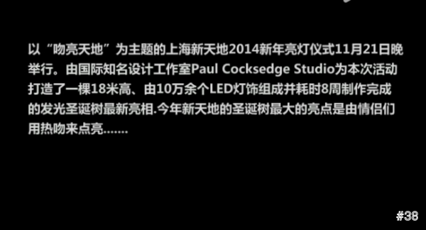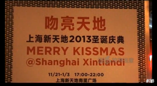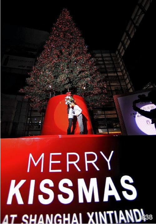 上海新天地今年聖誕節架起一個18米高的聖誕樹,名為「親吻聖誕樹」,是來自倫敦設計工作室Paul Cocksedge Studio,設計,號稱只要情侶在樹下親吻,聖誕樹就會亮。人們在樹下親吻的次數會在樹旁的電子計數器上顯示,每完成一次親吻上海新天地就會自動捐出一筆善款。