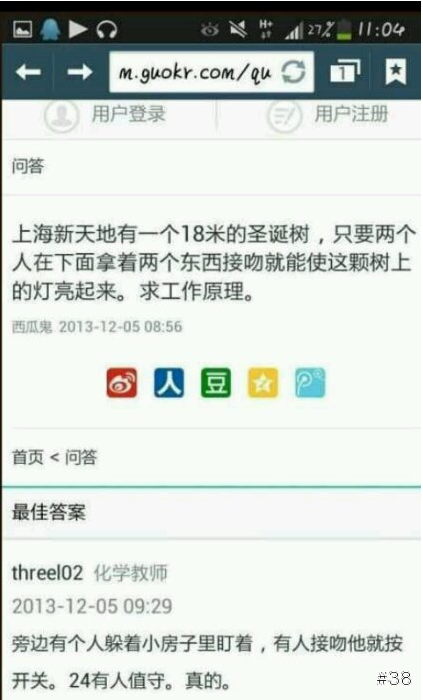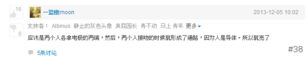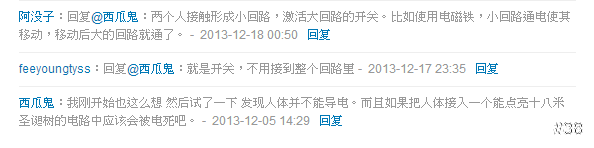 其實人體實際上真能靠著手牽手來導電,也的確是可以觸發開關讓聖誕樹亮起來。但是果殼網是採用投票制度的,網友考量到當地的國情,最後把最佳答案投給了下面的這個答案。