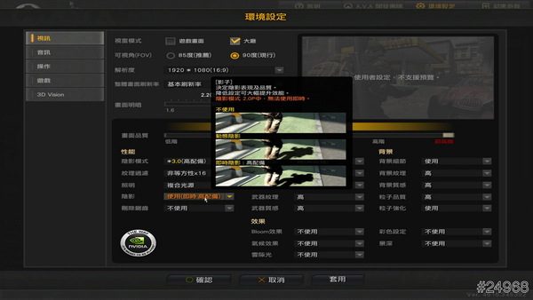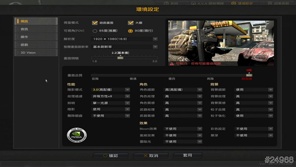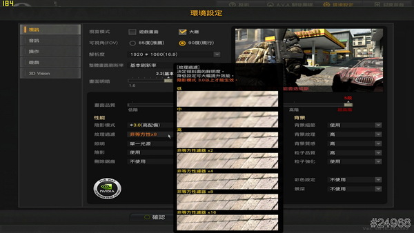 對於畫質表現好像都沒地方可以調整,終於在環境設定找到,也不知Asus 650Ti 對上AVA戰地之王要怎麼調整,乾脆直接把設定都調至最高後試看看,不行再往下調降就好。